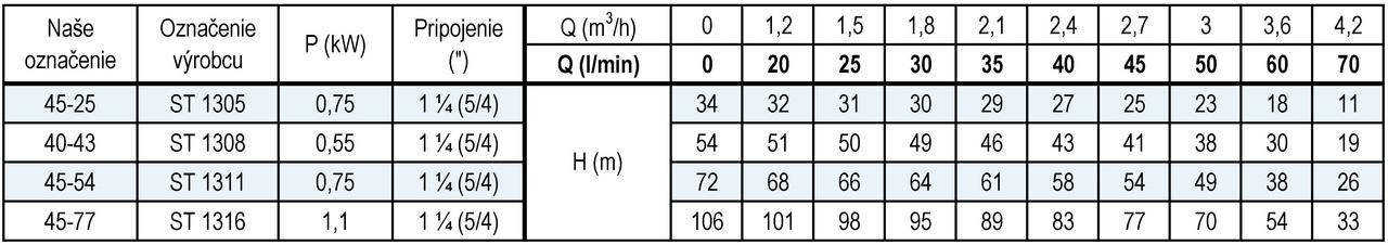 - Optimálny pracovný bod: 45 l/min pri 54 m.