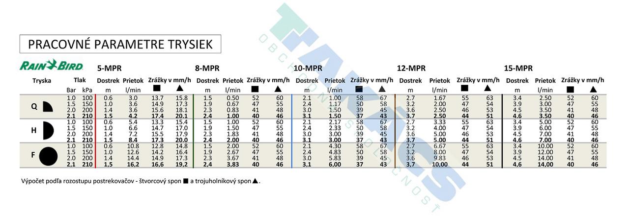 Základné parametre sérií trysiek Rain Bird MPR